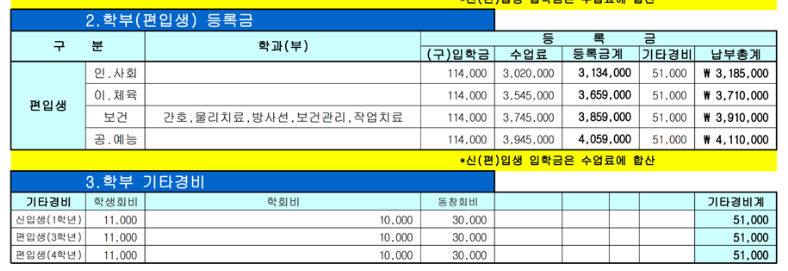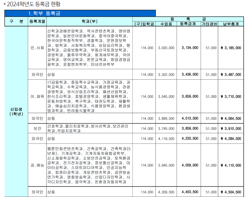 최초 계열별 등록금액으로, 개인별 국가장학금 또는 기타 장학금 적용 시 실납부액은 줄어들게 됩니다.
