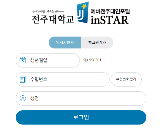 전주대 기숙사 신청을 하려면 입시지원자의 경우 생년월일, 수험번호, 성명을 입력 후 로그인 해야 합니다. 수험번호를 모를 경우 바로 옆에 "수험번호 찾기"를 이용하시기 바랍니다.