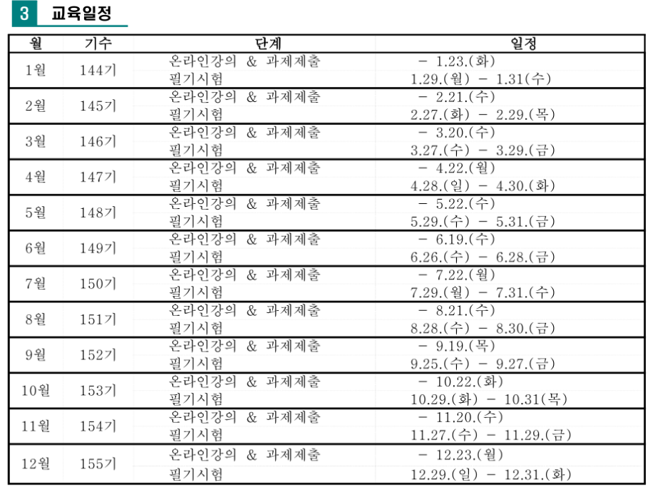 현재 2월 온라인강의 일정은 끝난 상태이며 3월 1일 ~ 3월 20일까지 접수를 받습니다. 필기시험은 3월 27일 ~ 3월 29일 (금)입니다. 자세한 교육일정 및 안내는 아래 파일을 확인하시기 바랍니다.