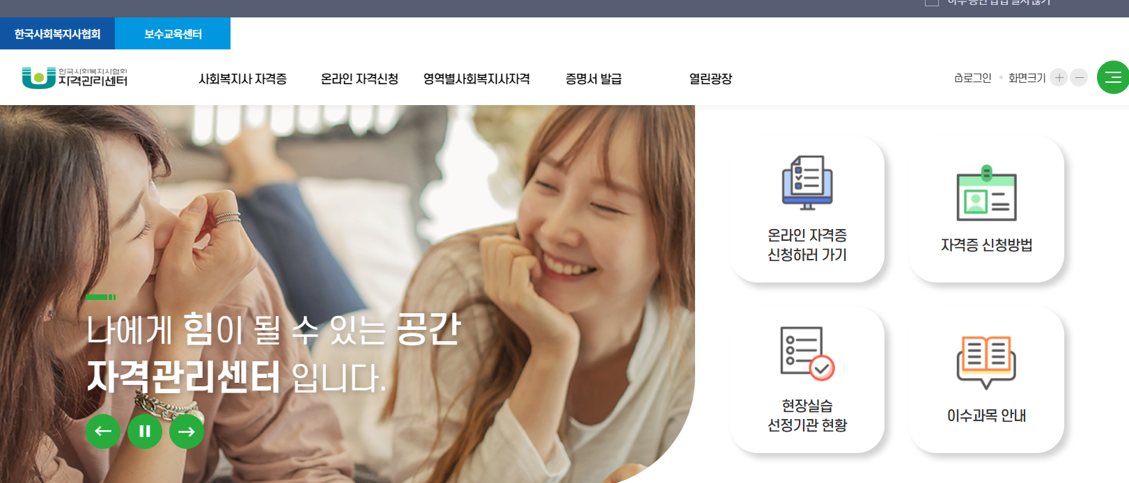 자격관리센터 홈페이지 바로가기 주소는 (welfare.net)입니다. 이곳에서 온라인으로 자격증 신청하기 및 자격증 신청방법, 현장실습 선정기관 현황, 이수과목 안내, 공지사항, 증명서 발급 등 다양한 정보 및 이용을 할 수 있습니다.