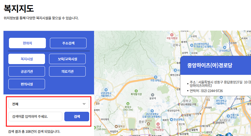 복지지도를 통해 전국의 다양한 복지설을 검색하여 찾을 수 있습니다.