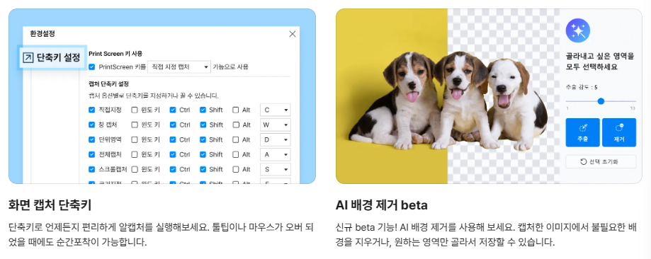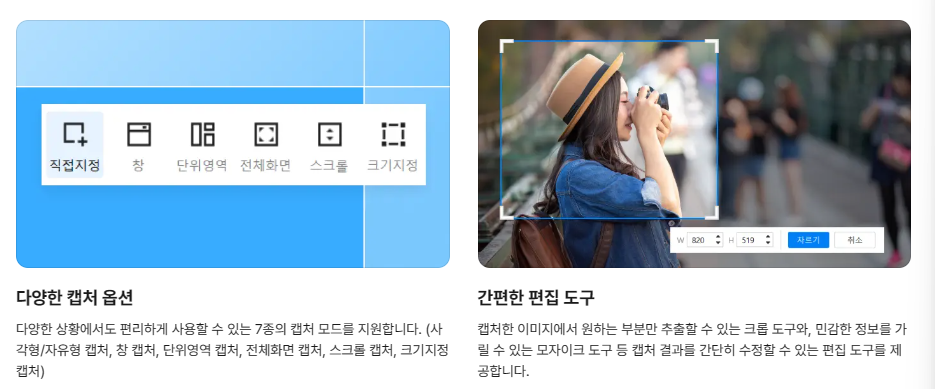 - 사각형, 자유형, 단위영역, 창, 전체, 스크롤, 지정사이즈 캡처 가능합니다.
