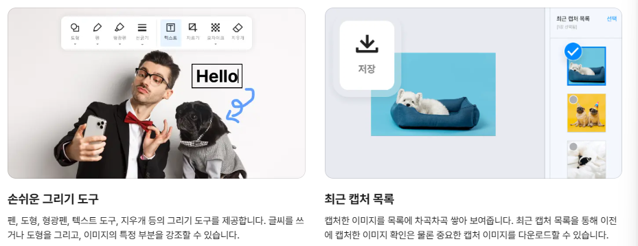 - 캡처한 이미지 위에 그림을 그리거나 간단한 수정을 할 수 있는 그리기 및 편집 도구 제공(텍스트, 모자이크 등등)