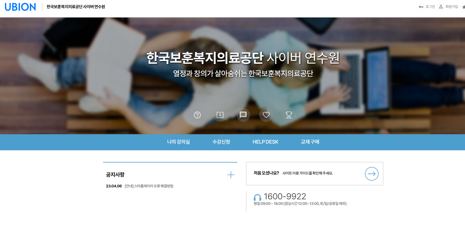 한국보훈복지의료공단 사이버연수원 홈페이지 바로가기 주소는 (ubion.co.kr)입니다. 처음이시라면 회원가입을 진행하셔야지 수강신청이 가능합니다.