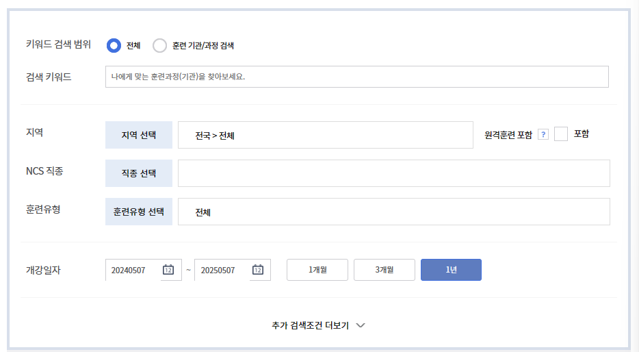 나에게 맞는 훈련과정을 찾기 위해 검색 키워드를 입력 후 지역, NCS 직종, 훈련유형 선택, 개강일자 필터를 입력 후 검색하면 자세한 훈련과정을 보여드립니다.