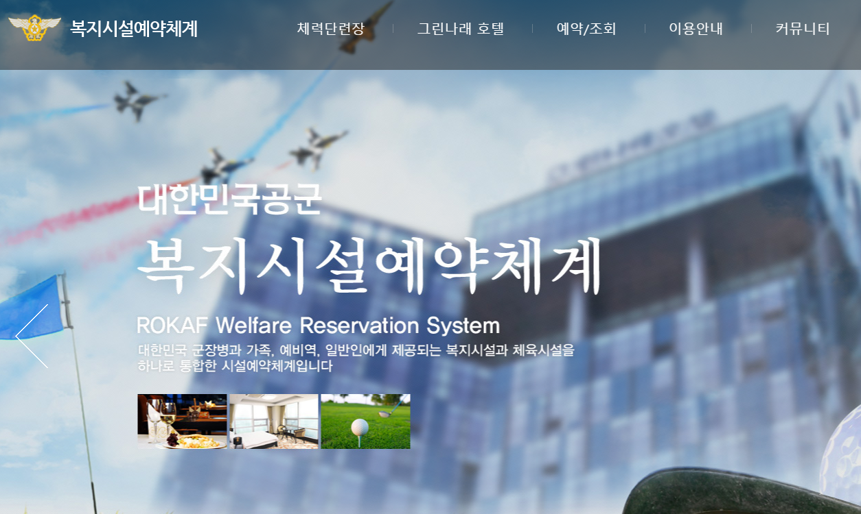 복지시설예약체계 홈페이지 바로가기 주소는 (airforce.mil.kr)입니다. 공군체력단련장은 국내 14곳에서 이용이 가능하며, 골프장, 호텔, 콘도, 웨딩홀 등을 예약 및 조회할 수 있습니다.