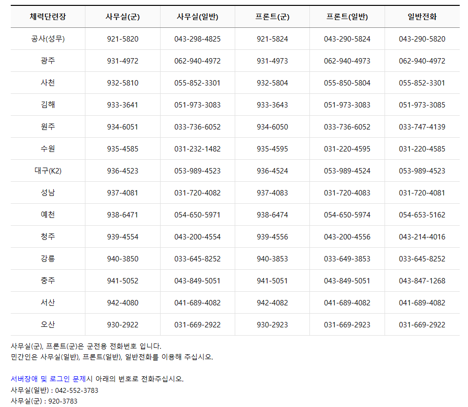 - 체력단련장별 전화번호