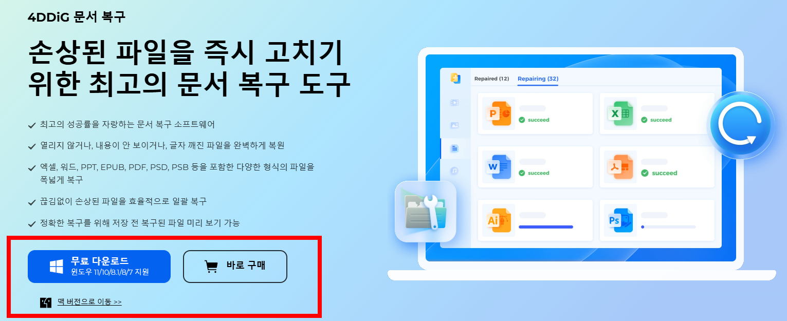 손상된 문서 또는 깨진 글자 파일, 열리지 않는 문서 등을 빠르게 복구할 수 있는 프로그램입니다. 엑셀뿐만 아니라, 워드, PPT, EPUB, PDF, PSD, PSB, 등을 포함한 다양한 형식의 파일을 빠르게 복구합니다.